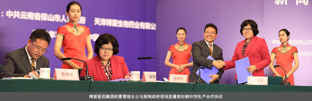 會議最后,博愛醫(yī)藥董事長夏雪城女士與施甸政府在現(xiàn)場簽訂了紫杉醇針劑生產(chǎn)的合作協(xié)議,正式締結伙伴關系,這意味著目前我國最大的紫杉醇及紫杉醇注射液生產(chǎn)、研發(fā)基地將啟動建設并落戶云南施甸,該項目全面投產(chǎn)后,中國將擁有紫杉醇的世界定價權。