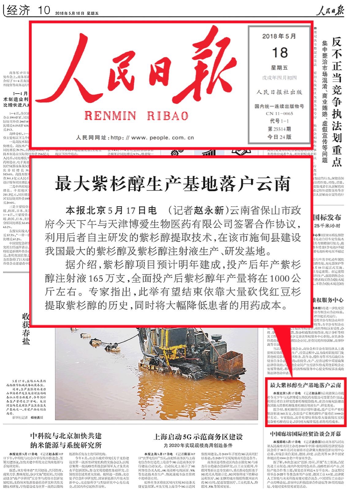 本報(bào)北京5月17日電 (記者趙永新)云南省保山市政府今天下午與天津博愛生物醫(yī)藥有限公司簽署合作協(xié)議,利用后者自主研發(fā)的紫杉醇提取技術(shù),在該市施甸縣建設(shè)我國最大的紫杉醇及紫杉醇注射液生產(chǎn)、研發(fā)基地。