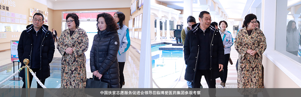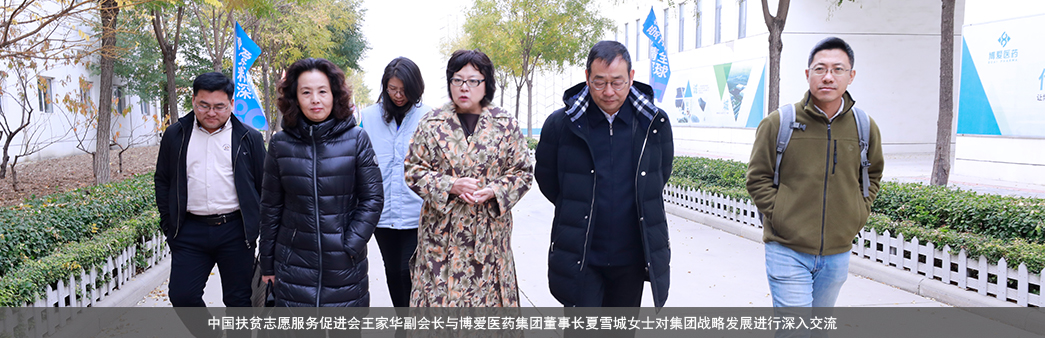 2018年11月8日,中國扶貧志愿服務促進會王家華副會長,中國扶貧志愿服務促進會、中國防癆協(xié)會辦公室主任邵文芬等領導一行在博愛醫(yī)藥集團董事長夏雪城女士的陪同下參觀視察了博愛醫(yī)藥集團。